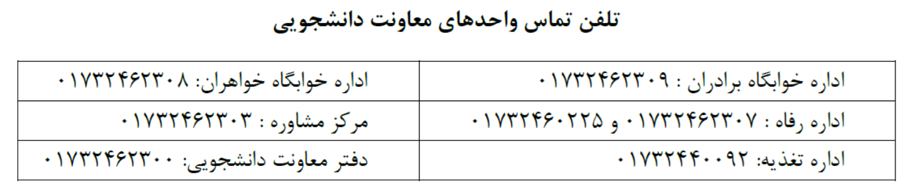 پذیرفته‌شدگان گرامی در صورت داشتن هرگونه سوالی می‌توانند در ساعات اداری (8 الی 15) با شماره 32251708-017 (جناب آقای خادم) تماس حاصل فرمایند.