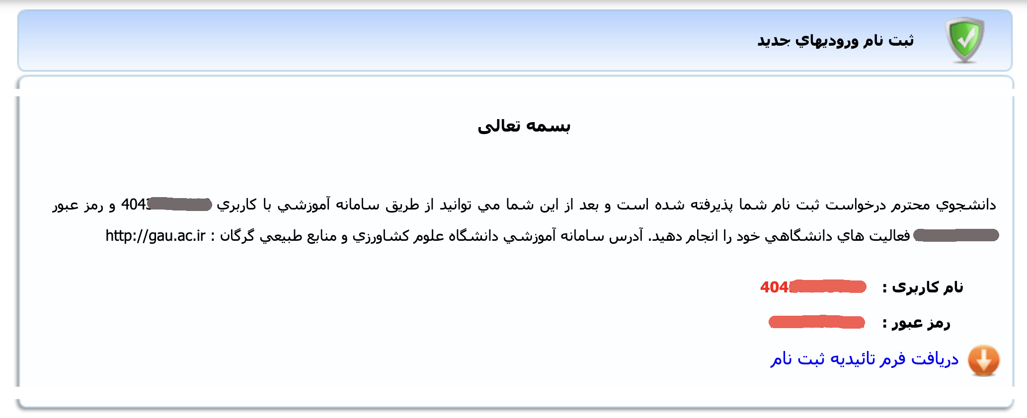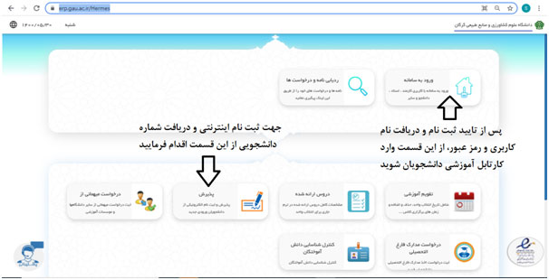 ضمن تبریک قبولی و آرزوی موفقیت به کلیه پذیرفته‌شدگان گرامی، به اطلاع می رساند ثبت نام اولیه پذیرفته‌شدگان در کلیه رشته ها بصورت غیرحضوری (اینترنتی) از ساعت 8 صبح روز سه‌شنبه 22 مهرماه لغایت شنبه 26 مهرماه 1404 انجام می شود. لذا کلیه پذیرفته‌شدگان می بایست ضمن رعایت موارد ذیل در تاریخ‌های مشخص به سامانه آموزشی دانشگاه (erp.gau.ac.ir) مراجعه و نسبت به ثبت نام غیرحضوری خود اقدام نمایند. پس از ثبت نام اولیه (اینترنتی) لازم است از ساعت 8 صبح روز یکشنبه 27 مهرماه لغایت سه‌شنبه 29 مهرماه 1404 جهت ثبت نام حضوری و تحویل مدارک به ساختمان نوآوری واقع در پردیس دانشگاه علوم کشاورزی و منابع طبیعی گرگان مراجعه نمایند.